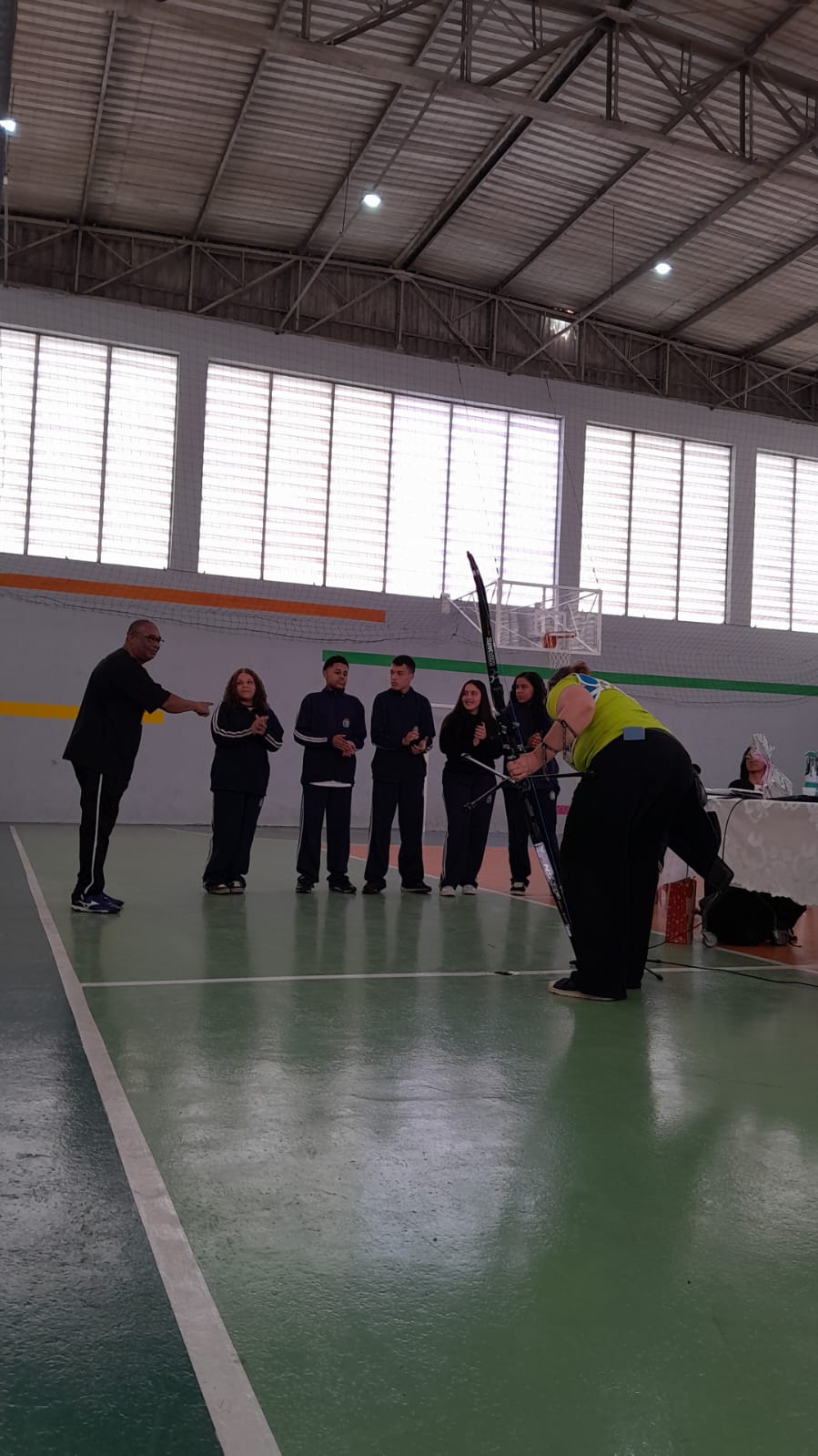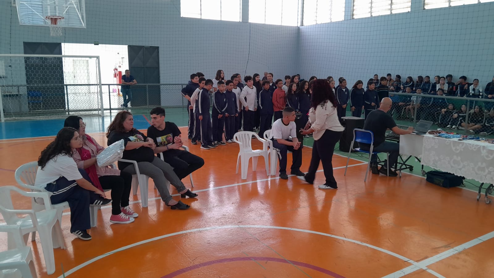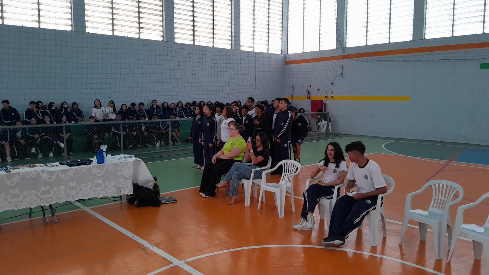 Logo na chegada, a atleta foi recebida com cartazes e muitos aplausos pelos alunos, que lotaram a quadra da unidade escolar. O clima de alegria e curiosidade deu o tom do encontro, repleto de demonstrações práticas, música e situações inesquecíveis.