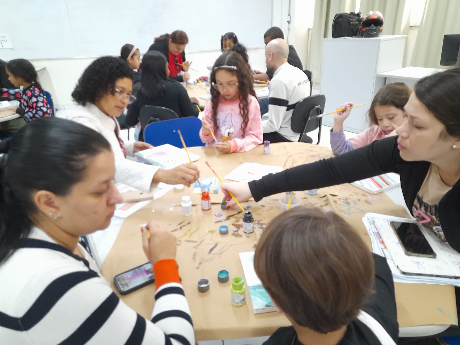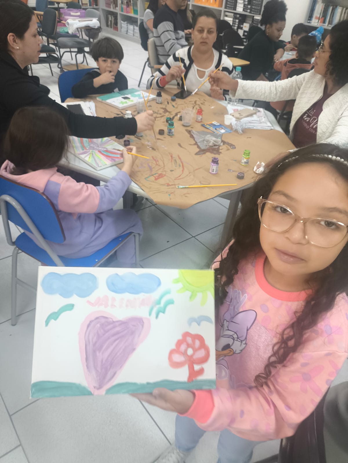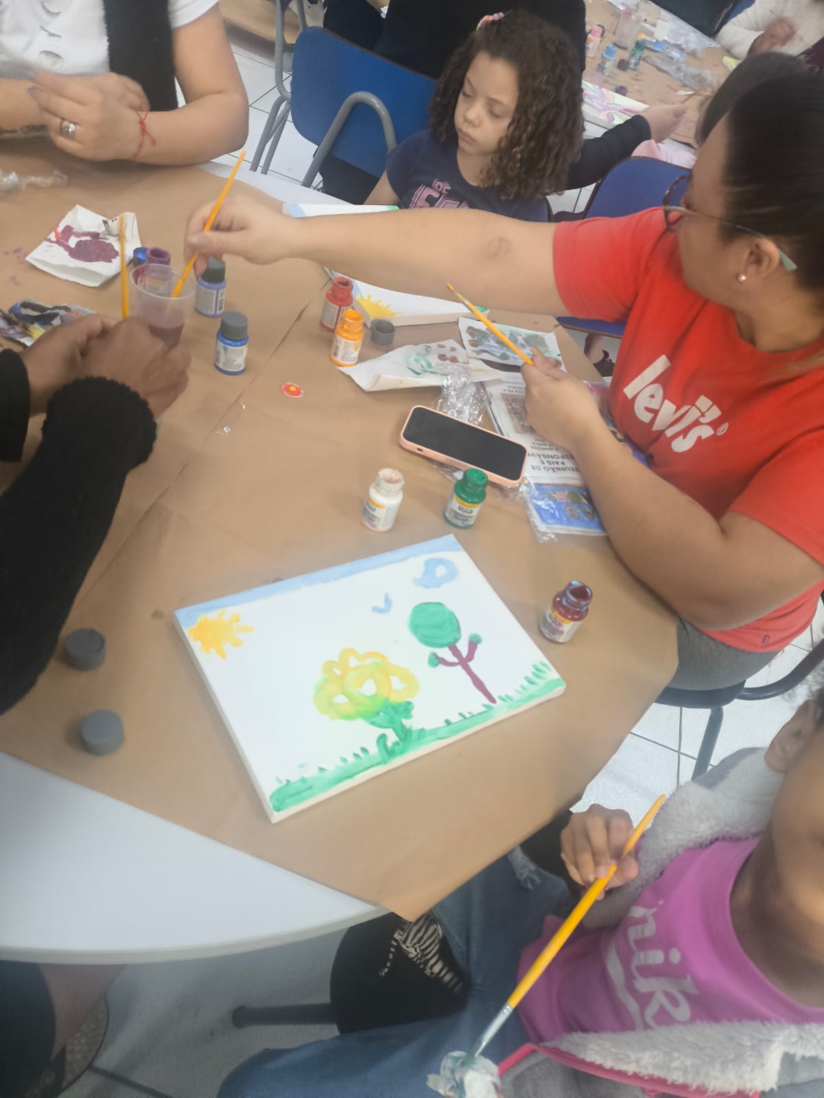 • Oficina de pintura em tela realizada com os pais e a comunidade, promovendo integração e valorizando o protagonismo das famílias no processo educativo.