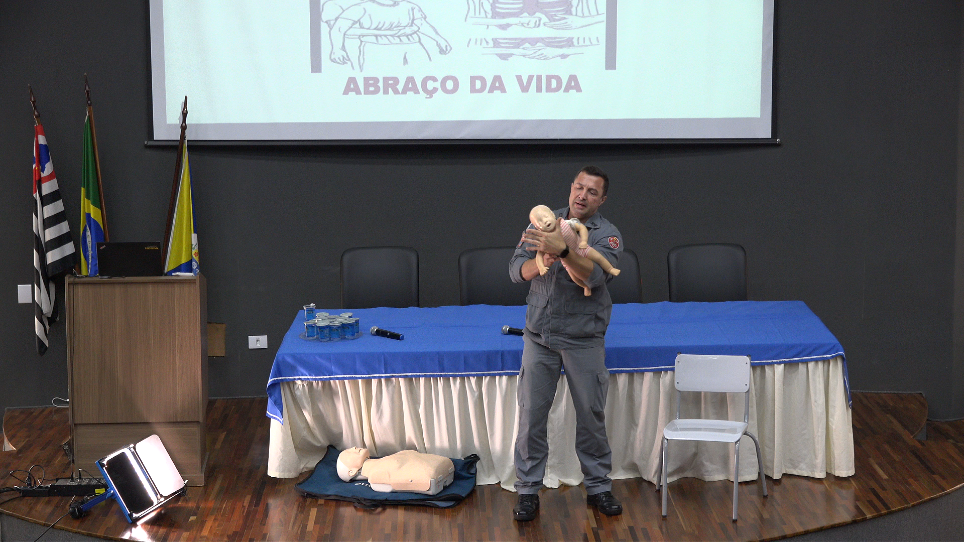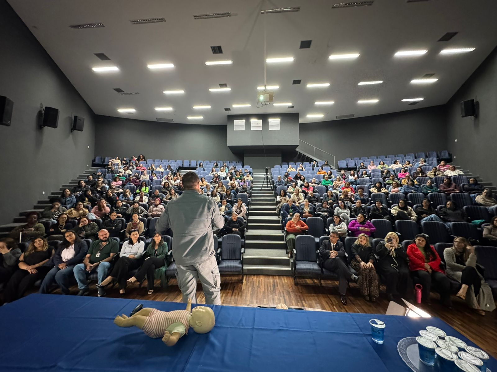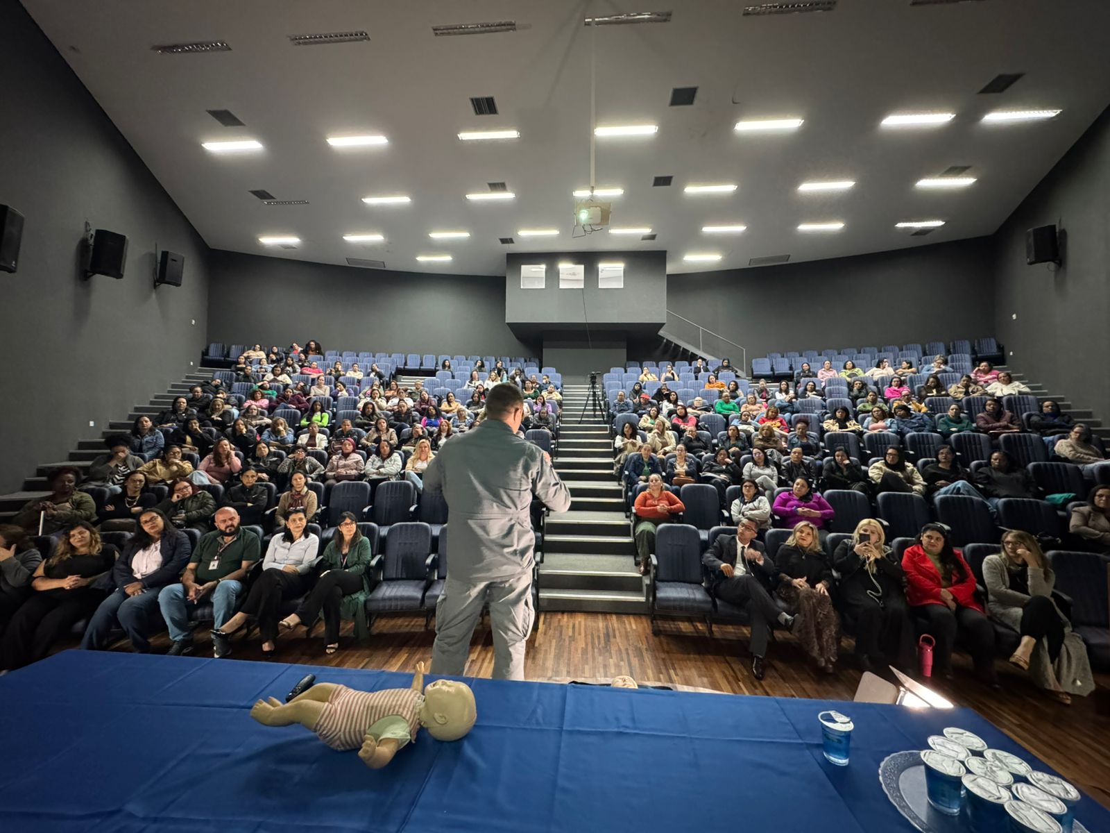 Durante a palestra, os dois especialistas demonstraram técnicas fundamentais para o atendimento rápido e eficaz em casos de engasgo e outras situações comuns no cotidiano escolar. A abordagem também explicou a importância da Lei Lucas, que determina a obrigatoriedade de capacitação em primeiros socorros para profissionais da educação.