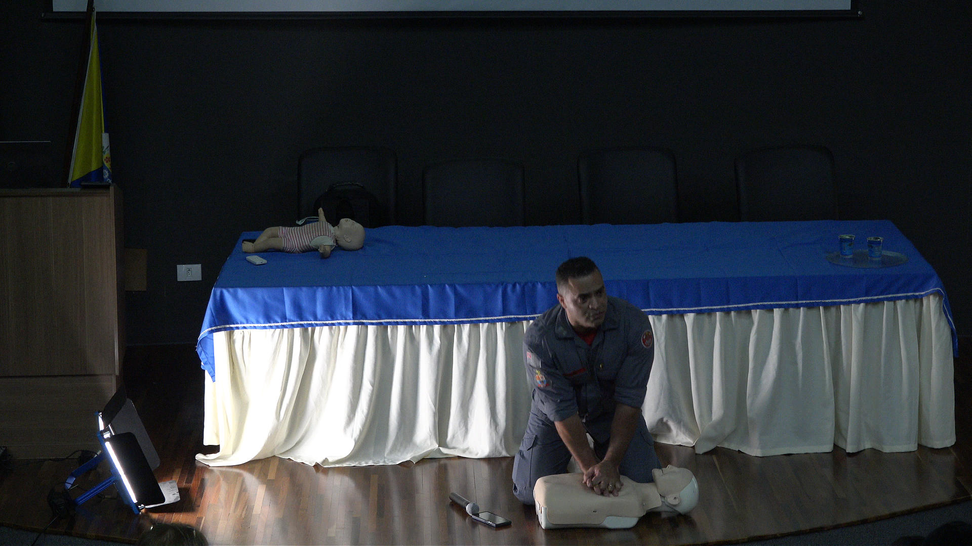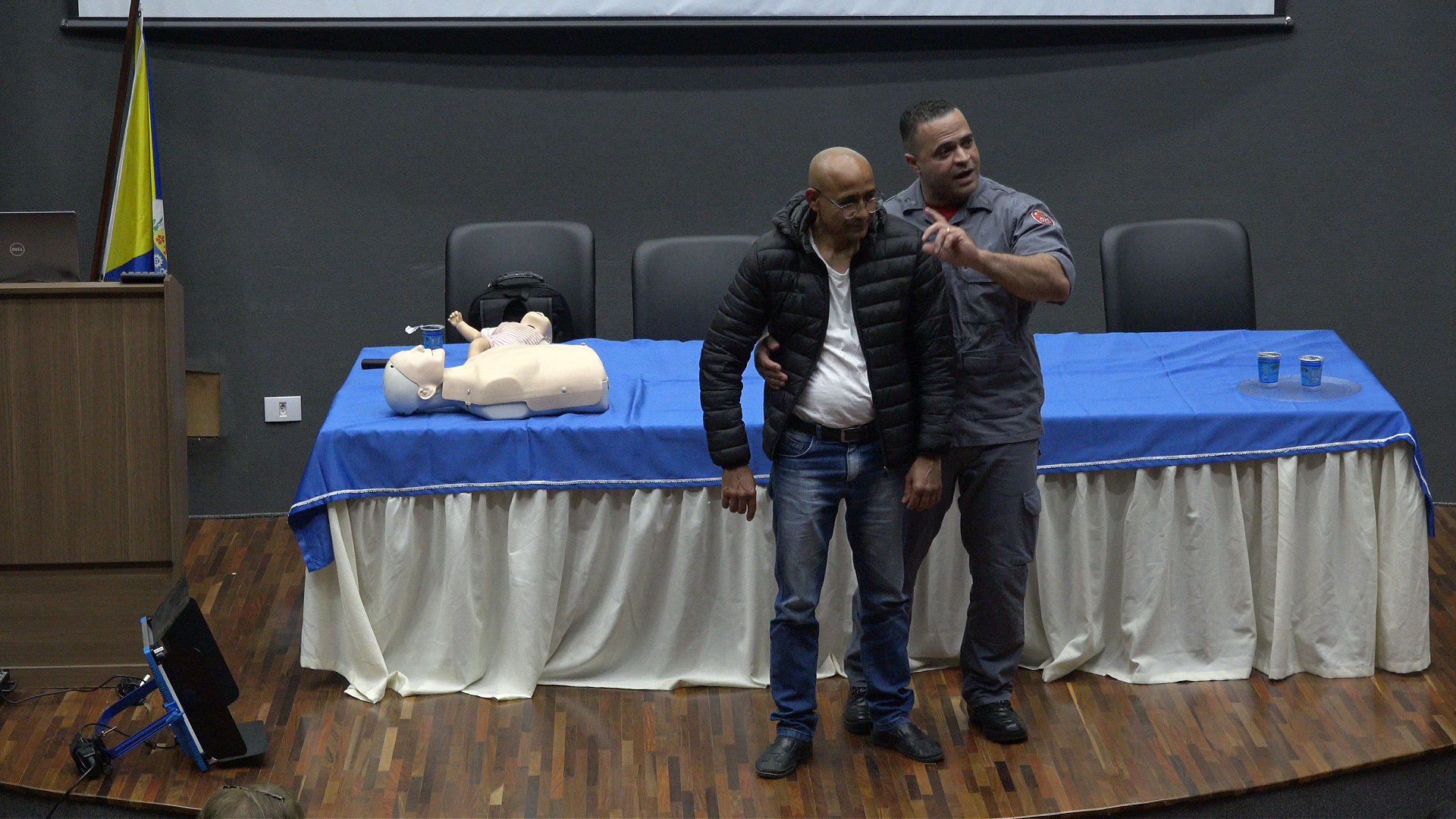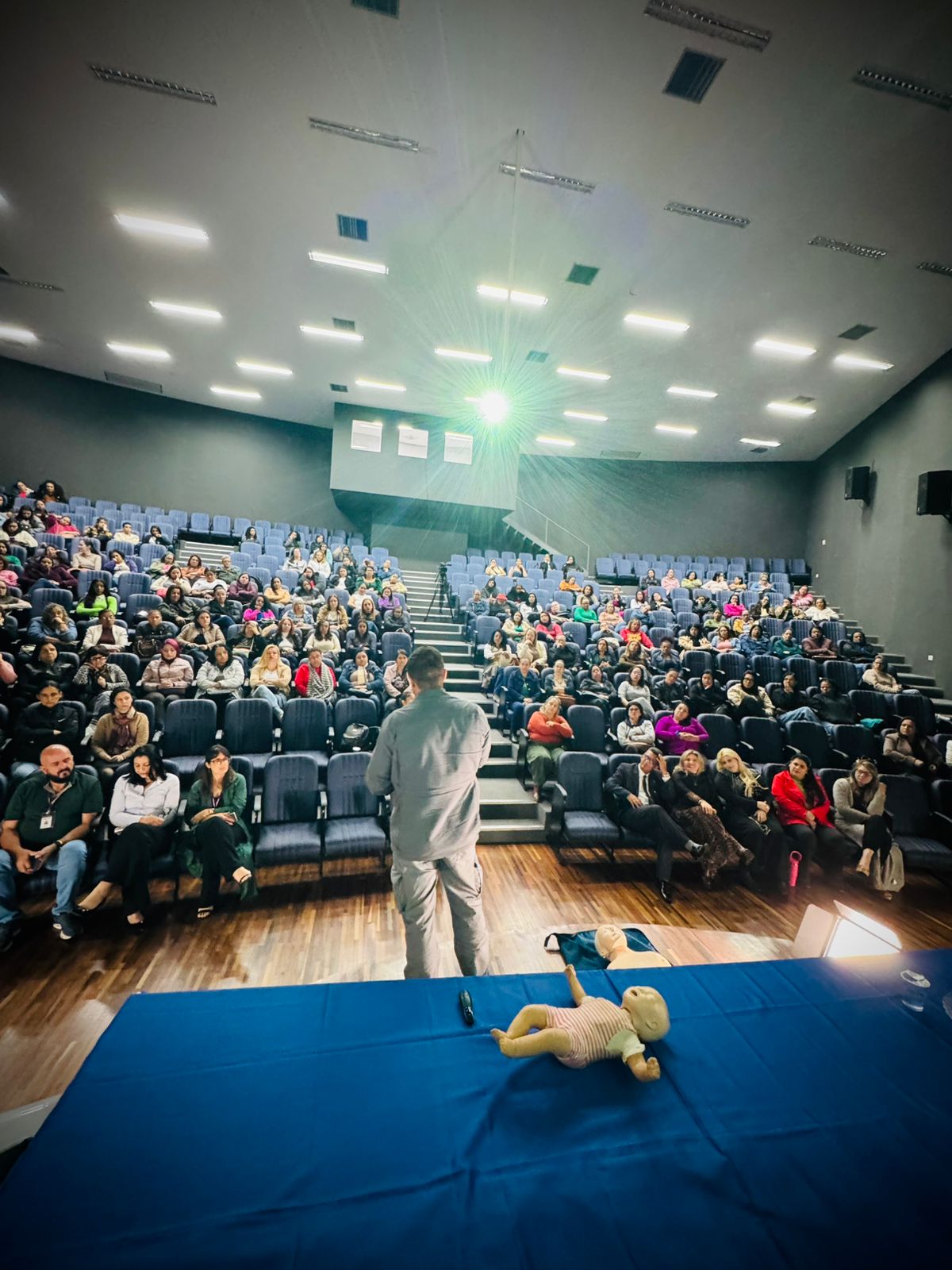 Durante a palestra, os dois especialistas demonstraram técnicas fundamentais para o atendimento rápido e eficaz em casos de engasgo e outras situações comuns no cotidiano escolar. A abordagem também explicou a importância da Lei Lucas, que determina a obrigatoriedade de capacitação em primeiros socorros para profissionais da educação.